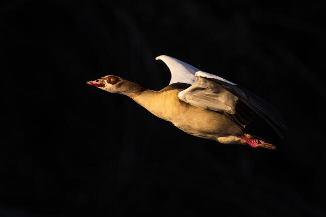 The Egyptian Goose while flying early morning in between the nile river and the small hills