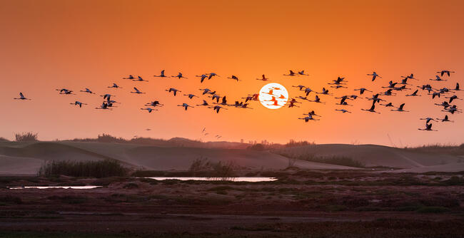 Gyalogosan a Namibiai Walvis Bay melletti mocsaras területen egy monopod segítségével megküzdve a süppedős homokkal, készült a felvétel.