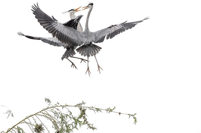 While I was waiting for the black kites to arrive I had two grey herons on my left high up on the last branch of a tree, when suddenly they started to fight each other without holding back