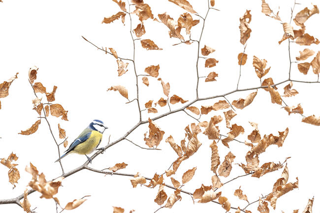Autumn in the Alps mountains can always bring great surprises. In the woods, among the leaves of a hornbeam, a Eurasian blue tit is probably moving in search of food or something else. The white background amplifies the texture of the branches, whose dry leaves are about to fall, and amplifies the silhouette of this beautiful songbird.
