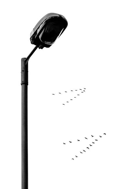 During the twilight hours, a group of Egrets aligns themselves in an arrow formation, providing a striking contrast against the backdrop of a street lamp in the urban landscape in Hong Kong.