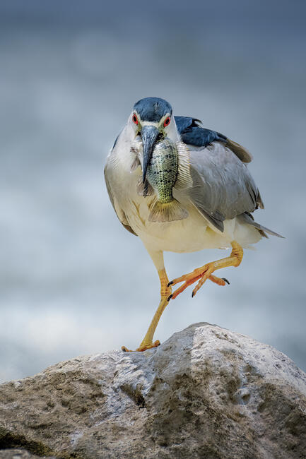 In a breathtaking moment of nature, a Black-crowned Night Heron grips its precious prey—a glistening fish writhing in a desperate attempt to escape—within its sharp beak. The soft sunlight reflects on the calm water, highlighting the bird’s dark feathers and piercing eyes, revealing the skill of a seasoned hunter. In this crucial instant, the heron prepares to swallow its catch, embodying the striking balance between survival and instinct in the wild.