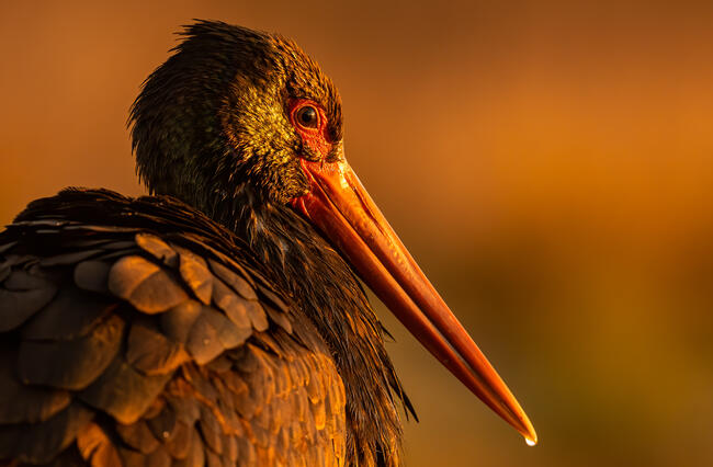 A fénykép a Hortobágyi Nemzeti Parkban készült. A fekete gólya szárítkozik a felkelő nap melegében. A fekete gólya egész fészkelőterületén veszélyeztetett faj. Magyarországon a fokozottan védett fajok kategóriájába tartozik, eszmei értéke 500.000Ft.