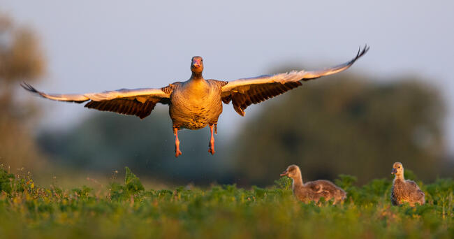 Lúd mama érkezik a reggeliző csemetékhez.