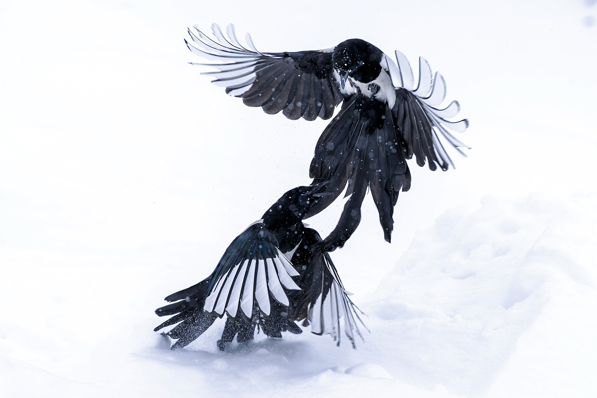 Magpie fight in snowfall