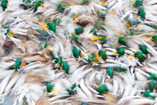 Szentpéterváron 2022-2023 telén a fotózás igen nehéz volt. Hetekig nem találkoztam olyan állatokkal, amelyekről jó fotó készülhetett volna, de nagyon szerettem volna fotózni. A külvárosi parkokban a befagyott vízszakaszon hatalmas vízimadár rajok, főleg kormoránok gyűltek össze, és eszembe jutott, hogy megörökítem a madarak alkotta mintázatok, amikor a madarak 100%-ban kitöltik a keretet. Aztán a felhős időjárás arra késztetett, hogy lassú zársebességet válasszak.