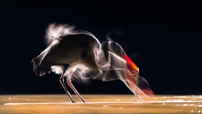 A kép egy expoból készült, és a lassú záridőnek köszönhető, ahogy a szürkegém zsákmány szerzését sikerült megörökíteni.