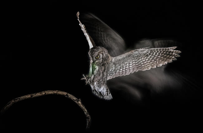 A füleskuvikok általában apró rovarokkal táplálják fiókáikat, amiből elég sokra van szükség, így a szülők egész éjjel hordják az élelmet. Az esetek nagy részében a beszállás nem közvetlenül a fészekre történik, hanem egy beszállóágról. Én azt akartam megfotózni, ahogy a beszállóágra érkezik a madár, ez sokkal nehezebb téma, a baglyok ugyanis gyakorlatilag hangtalan repülők, így résen kell lenni egész éjszaka, és elég sokat kellett próbálkozni, hogy összejöjjön a tervezett kép.