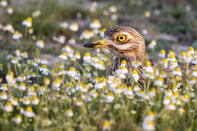 Az ugartyúk természetes élőhelye a Hortobágyon a kamillával tarkított szikes pusztai táj. A fotón szereplő madár a kamilla adta búvóhelyet választotta a földút mentén.