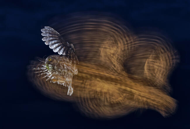 Kuvik és zsákmánya naplemente után. A felvétel elkészítéséhez lessátrat, meleg fényű lámpákat és vakut használtam.