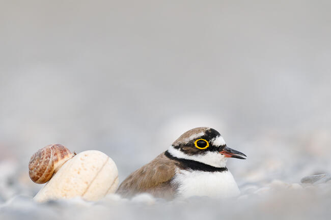 A lilék szívesen pihennek a sík partokon egy nagyobb kő mellé telepedve. Ezúttal a kő nem csak a madarat vonzotta. A fotó teleobjektívvel készült.
