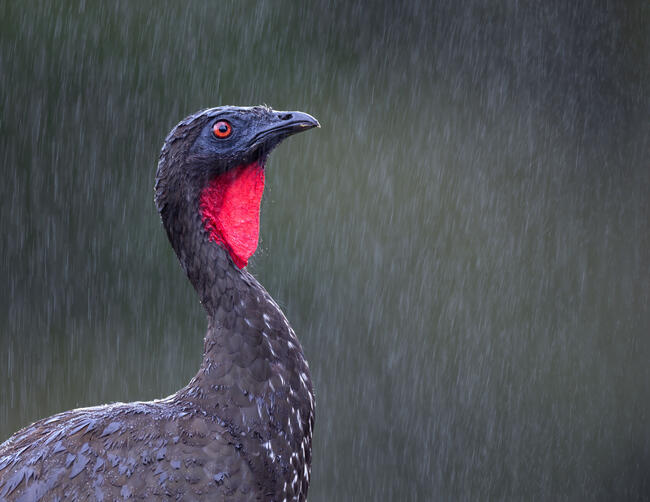 Ha az ember az esőerdőbe megy, számít rá, hogy előbb-utóbb leszakad az ég — és pontosan ez történt, amikor ezt a portrét készítettem. A borzas sakutyúk (Crested Guan) állt mozdulatlanul egy ágon, miközben az eső vízfüggönyként ömlött körénk. A levelek alatt zubogott a víz, a háttér elmosódott a párától és a esőzéstől , de ő nyugodtan, már-már méltóságteljesen viselte az eső áztatta pillanatot. Mintha csak ő lenne az erdő esőhöz szokott őrszeme – aki tudja: ez itt a rend.