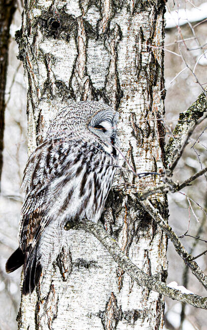 I love the texture of owl's feathures and texture of birch tree overlaping almost hiding the bird