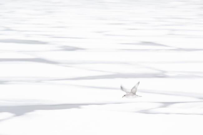 This image was made as I stood on the deck of a small expedition ship that was navigating the west coast of Svalbard. We experienced the most amount of drift ice for over two decades, and the patterns that the ice formed were wonderful. I chose a slow shutter speed to capture the wing movement of the Fulmar as it flew past, and this also served to soften the icy environment behind the bird. The air temperature was around -20 Celsius, making it challenging to photograph in such conditions.