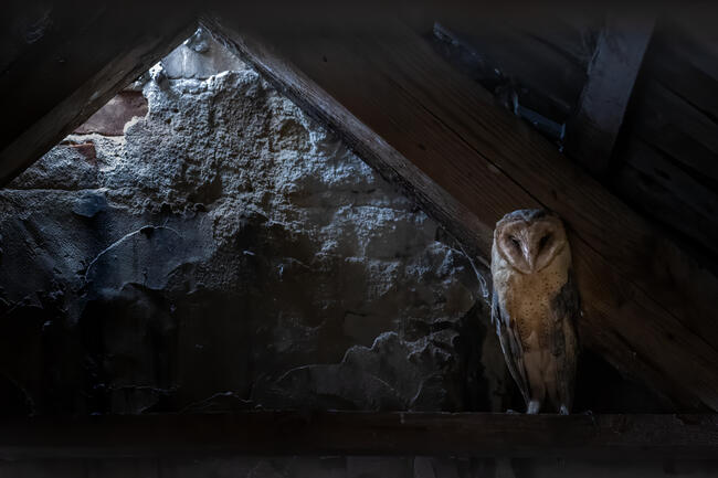 Together with my friend we decided to explore abandoned buildings in a village nearby, in one of them we found this Barn Owl sitting in the tiny beam of light created by a hole in the roof. Illuminated by the sun it looked very spooky!