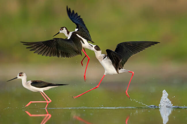 Near the town of Dedoplistskaro, there is a convenient lake for photographing waterbirds. In the spring, during migration, a large number of stilts stop there and apparently form pairs at the same time. The process is accompanied by fights among them all. I arrived early in the evening, set up a small hide, hid in it, and within 20 minutes, the stilts started returning to their spots, making it possible to photograph them.