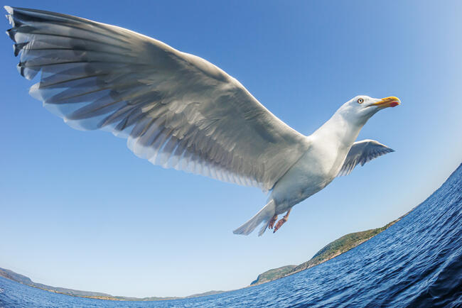 Sasokat fotóztunk a norvég fjordokban hajóból - a tapasztalt sirályok tömegesen követtek minket a könnyű élelem reményében. Mivel nagyon közel repültek hozzánk, egy 11 mm-es halszem objektívvel kísérleteztem, ennek a torzítása még nagyobbnak mutatja az egyébként sem kicsi madarat.