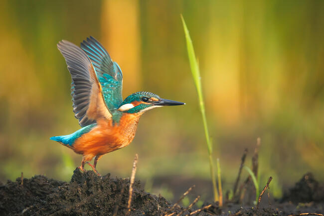 I built a hide on the edge of a drying puddle in a small river valley. My main goal was to photograph a common snipe, which I successfully managed to do. I also had luck capturing images of other shorebirds and rails. On the fifth day, something completely unexpected happened—a kingfisher landed right in front of me on the ground. It seemed to be scouting for a good fishing spot. After moving around the mud several times, it flew away and perched on a reed higher up.