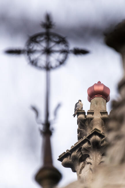 Nem kell elhagynunk a fővárost, ha izgalmas madármegfigyelésekre vágyunk, elég, ha nyitva tartjuk a szemünket, és a megfelelő helyen keresgélünk. Ez a vándorsólyom egy forgalmas belvárosi csomóponttól nem messze ült egy templom tornyát "díszítve", és kémlelte a templom parkjában mozgó énekesmadarakat, galambokat, potenciális prédára várva.