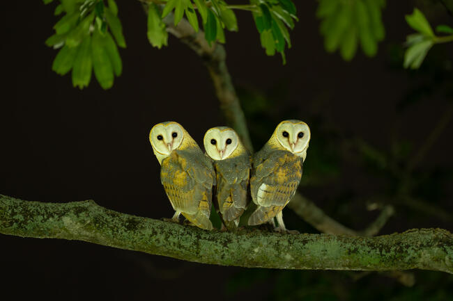 Three juvenile barn owls used a large branch of a tree that is behind my room to practice flying everynight,all of them flew around and perched on the same branch.On that day I waited for them as usual,they flew to a same brach one by one until all of them keep in touch and look at me promply.I use low speed shutther to take this picture in the dark.
