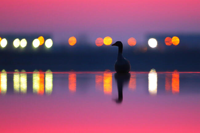 Még éjjel érkeztem a halastó partjára. Elhelyezkedtem a lessátoromban és a sötétedésig még picit szunyókáltam. Hangokra lettem figyelmes, és kitekintve láttam, hogy pár liba érkezett a tóra. Manuális fókusszal tudtam csak élességet állítani a sötétség miatt. Majd visszanézve az LCD kijelzőt ,ez a kép jelent meg rajta. A háttérben egy gyár fényei láthatóak, ezzel adva különleges hangulatot a képnek. Nagyon örültem a korai találkozásnak.