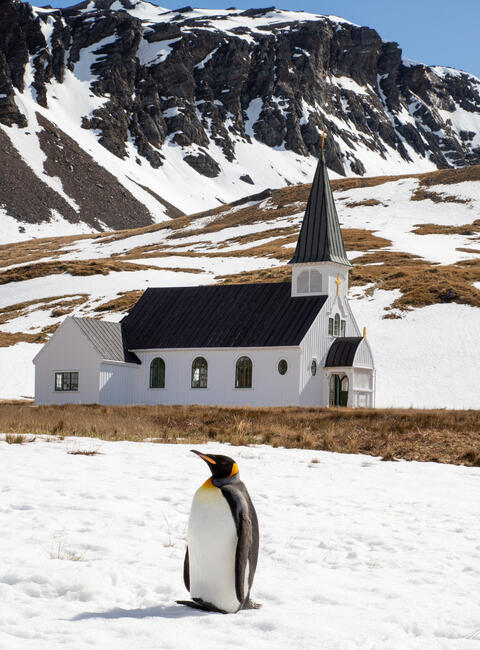 Egykoron norvég bálnavadász település temploma, ma már csak turista látványosság, kíváncsi királypingvinek tarkítják a képet.