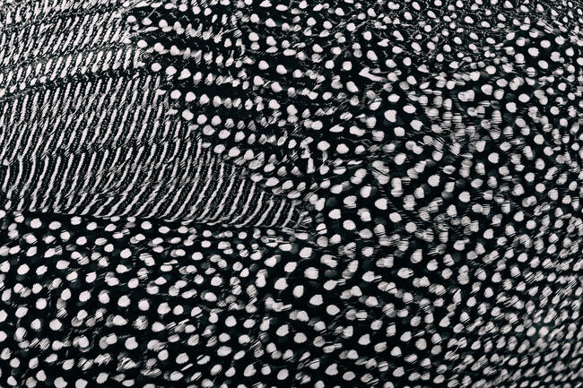A gyöngytyúk tollai első pillantásra absztrakt textúraként jelennek meg, mégis az elegancia és a kifinomultság mélyrétegeit hordozzák, éppúgy, mint a legnagyobb divatfotók. A fekete-fehér kompozíció a természet és a divat közötti finom kapcsolatot vizsgálja, ahol a természetes formák a klasszikus és kortárs stílusok találkozását tükrözik.